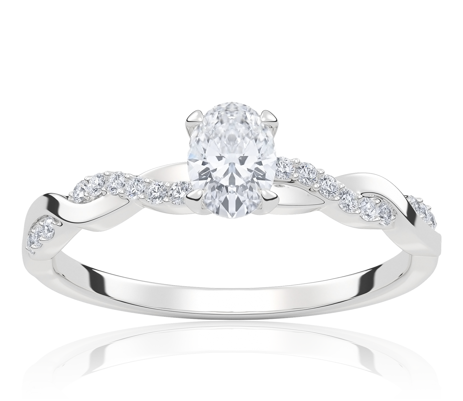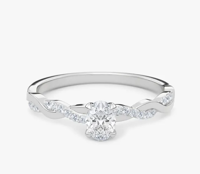 Pierścionek zaręczynowy Wila to kwintesencja subtelnej elegancji i naturalnej harmonii. Zachwyca niepowtarzalnym splotem obrączki, który symbolizuje splatanie się dwóch dróg w jedną wspólną historię. Centralny owalny diament lśni pełnią blasku, podkreślając wyjątkowość chwili, a towarzyszące mu drobne kamienie osadzone w oplatającej obrączce dodają całości lekkości i romantycznego charakteru.