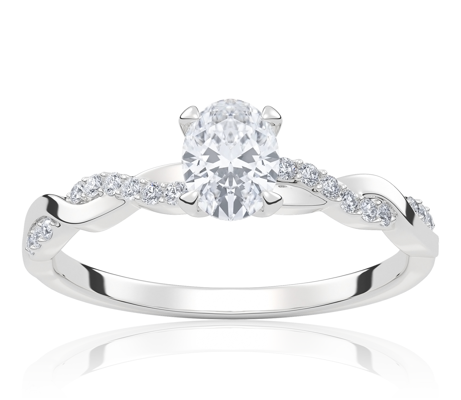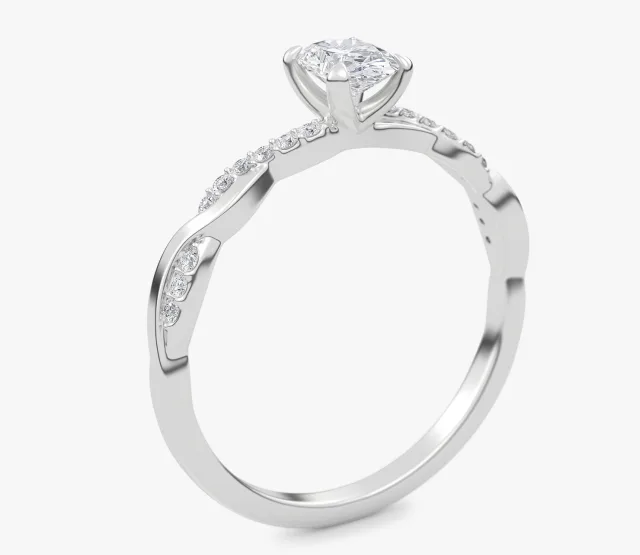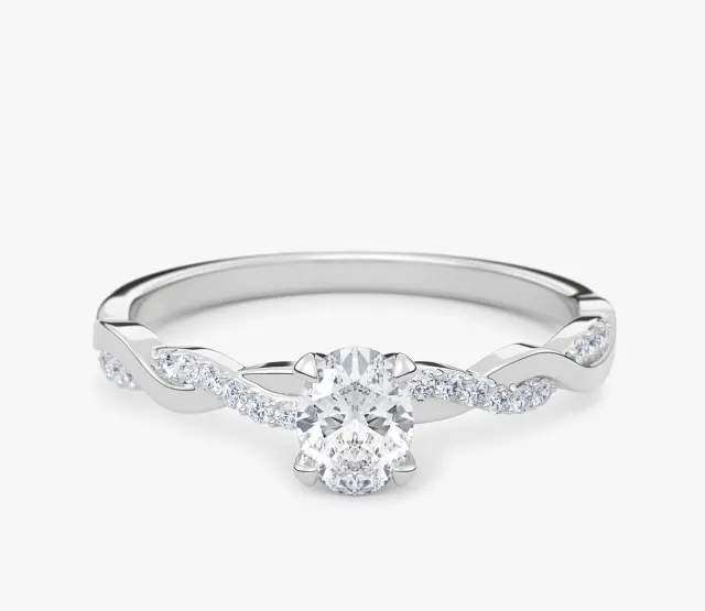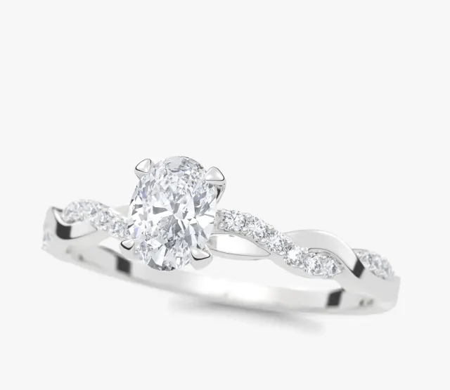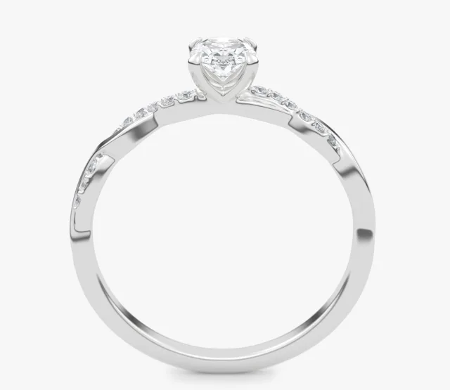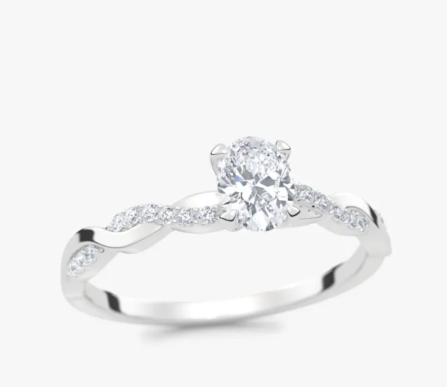 Pierścionek zaręczynowy Wila to kwintesencja subtelnej elegancji i naturalnej harmonii. Zachwyca niepowtarzalnym splotem obrączki, który symbolizuje splatanie się dwóch dróg w jedną wspólną historię. Centralny owalny diament lśni pełnią blasku, podkreślając wyjątkowość chwili, a towarzyszące mu drobne kamienie osadzone w oplatającej obrączce dodają całości lekkości i romantycznego charakteru.