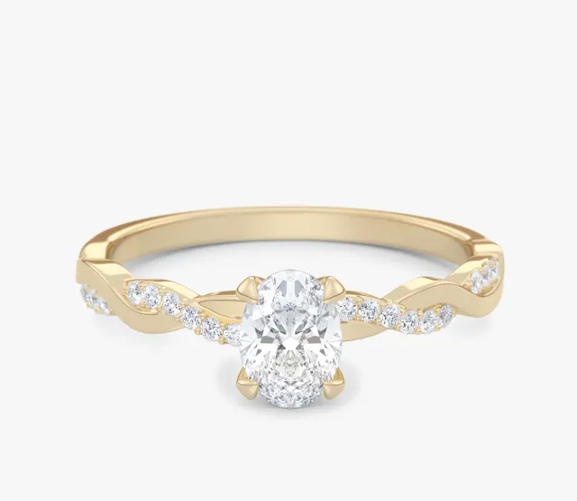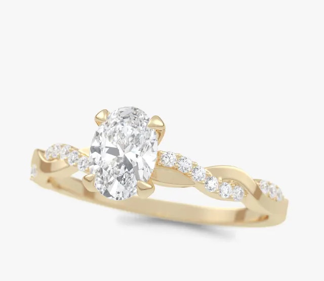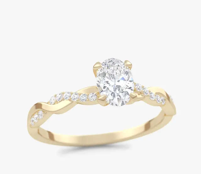 Pierścionek zaręczynowy Wila to kwintesencja subtelnej elegancji i naturalnej harmonii. Zachwyca niepowtarzalnym splotem obrączki, który symbolizuje splatanie się dwóch dróg w jedną wspólną historię. Centralny owalny diament lśni pełnią blasku, podkreślając wyjątkowość chwili, a towarzyszące mu drobne kamienie osadzone w oplatającej obrączce dodają całości lekkości i romantycznego charakteru.