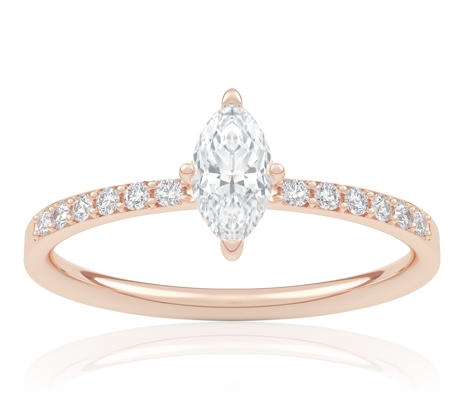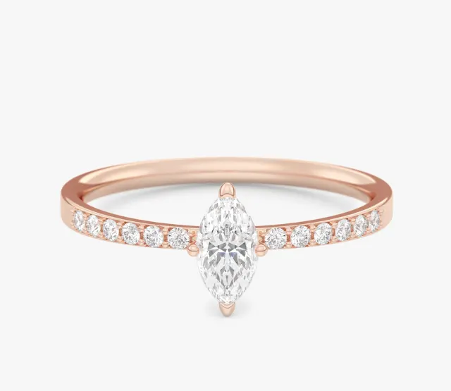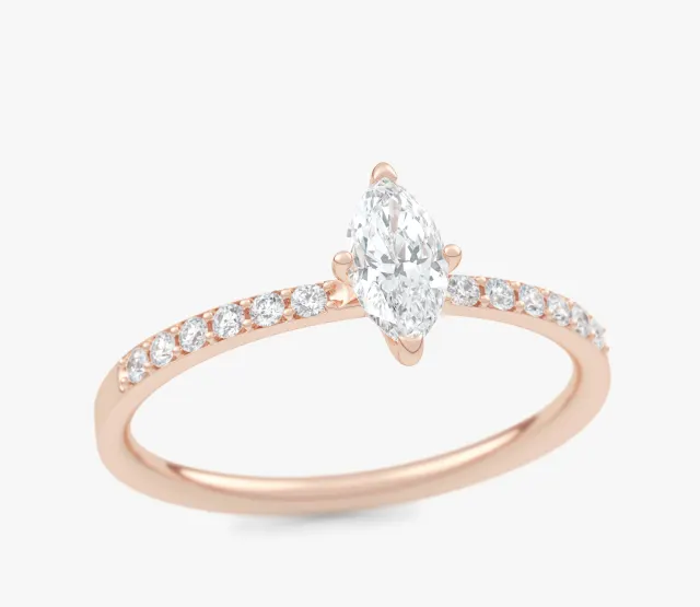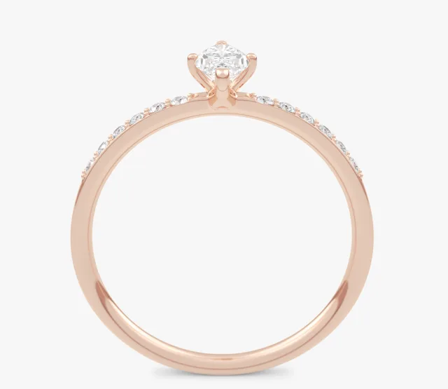 Pierścionek zaręczynowy Selene olśniewa blaskiem diamentu o kształcie markizy. Diament ten stanowi centralny punkt kompozycji, przyciągając wzrok swoim wyjątkowym szlifem i elegancją. Subtelne diamenty umieszczone na obrączce podkreślają jej smukłość i dodają całości niepowtarzalnego blasku.