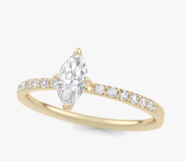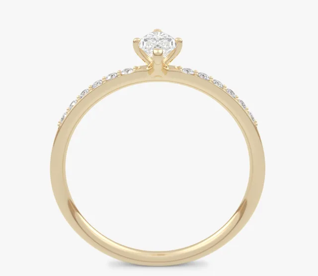 Pierścionek zaręczynowy Selene olśniewa blaskiem diamentu o kształcie markizy. Diament ten stanowi centralny punkt kompozycji, przyciągając wzrok swoim wyjątkowym szlifem i elegancją. Subtelne diamenty umieszczone na obrączce podkreślają jej smukłość i dodają całości niepowtarzalnego blasku.