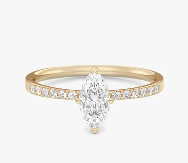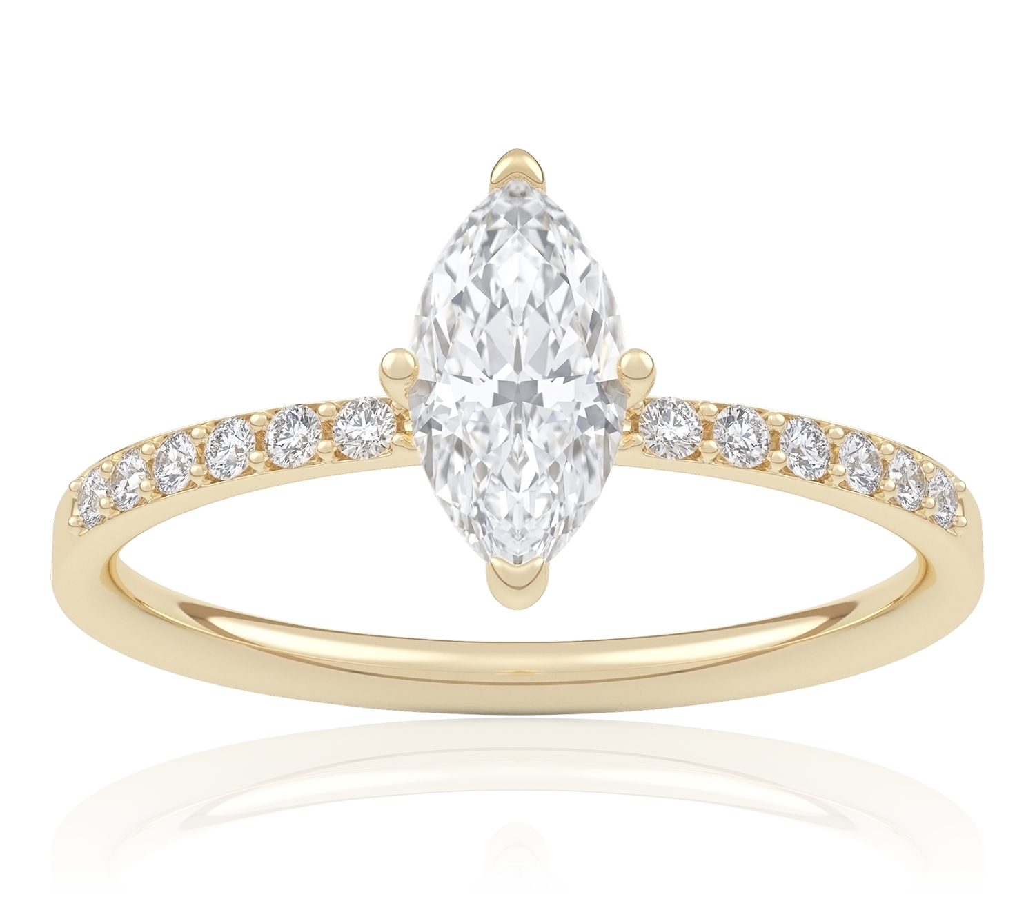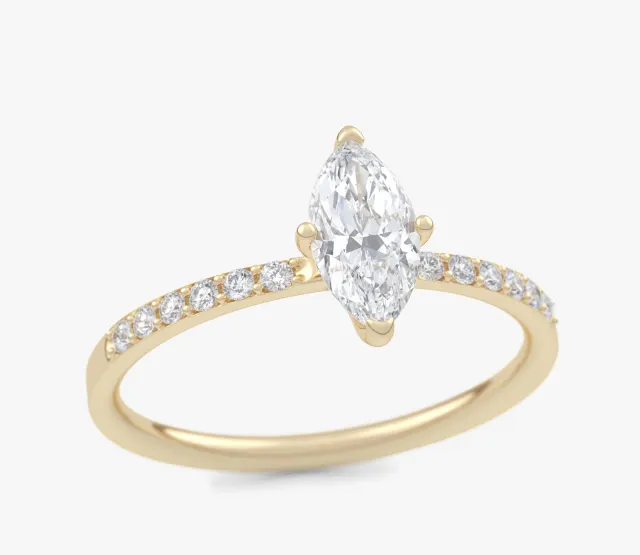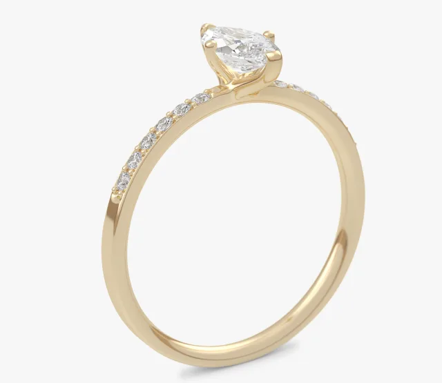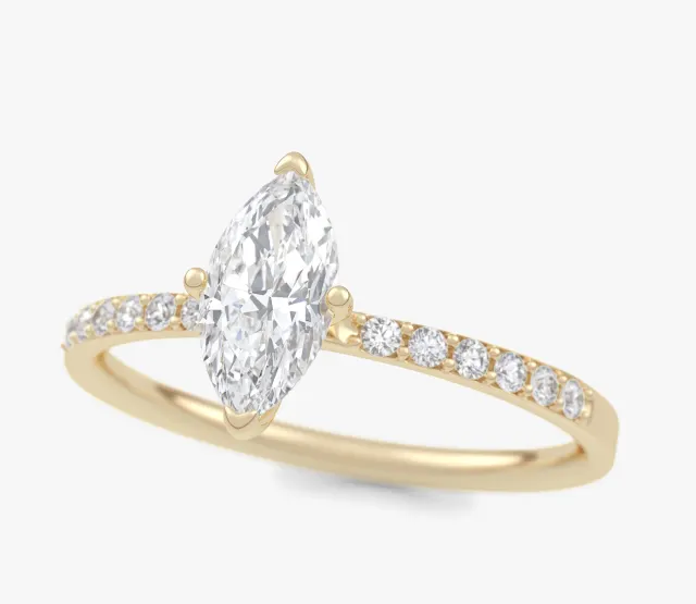 Pierścionek zaręczynowy Selene olśniewa blaskiem diamentu o kształcie markizy. Diament ten stanowi centralny punkt kompozycji, przyciągając wzrok swoim wyjątkowym szlifem i elegancją. Subtelne diamenty umieszczone na obrączce podkreślają jej smukłość i dodają całości niepowtarzalnego blasku.