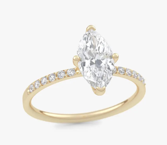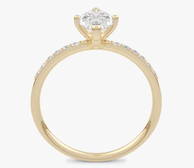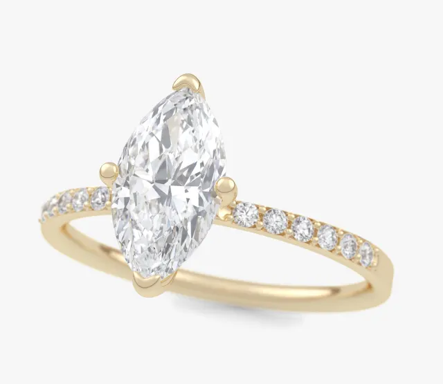 Pierścionek zaręczynowy Selene olśniewa blaskiem diamentu o kształcie markizy. Diament ten stanowi centralny punkt kompozycji, przyciągając wzrok swoim wyjątkowym szlifem i elegancją. Subtelne diamenty umieszczone na obrączce podkreślają jej smukłość i dodają całości niepowtarzalnego blasku.